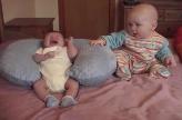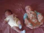 Philippe semble avoir beaucoup de plaisir à bouger ses pieds et ses mains alors j'essaie de faire comme lui. Malheureusement pour moi le cousin ne semble pas remarquer la présence de ma face sous sa main. |
